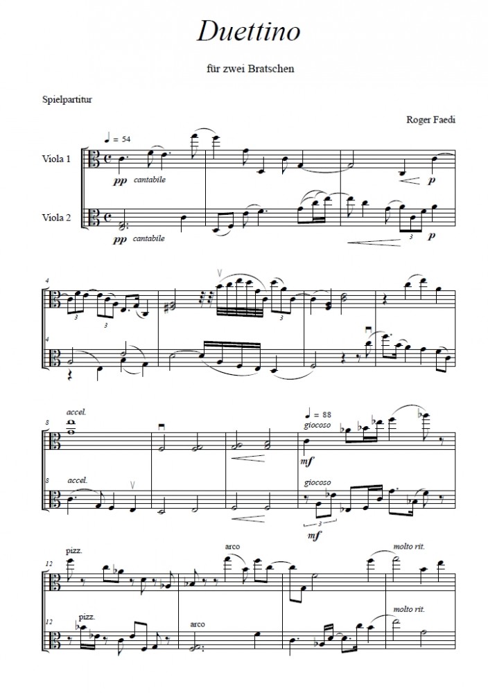 Die Auseinandersetzung mit Paul Klees Bild Duettino des Passanten aus dem Jahre 1938 veranlasste mich, dieses Stück zu schreiben. Zwei Menschen begegnen sich. Ihre Gesichtszüge beflügelten meine Fantasie, und ich versuchte auszudrücken, was in ihren Köpfen vorgeht. Es entstand gewissermassen eine in Musik gesetzte Psychographie. Ich entschied mich für die Besetzung mit zwei Bratschen, weil die geheimnisvolle Bildaussage wie auch der bräunlich-warme Bildhintergrund meinem Empfinden nach die Klangfarbe der Bratsche am ehesten widerspiegeln. Das Stück ist in freier Tonalität gesetzt, was mir ermöglicht, die Begegnung zweier Menschen musikalisch offener zu gestalten. Roger Faedi