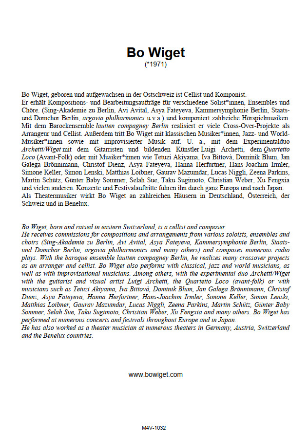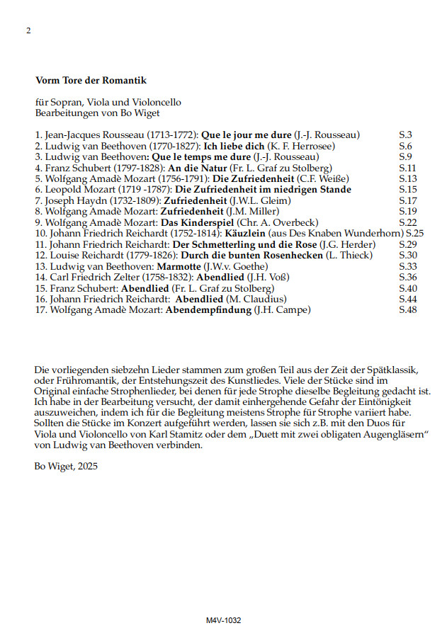 Der Schubert-Reigen besteht aus sechs Liedern von Franz Schubert in Bearbeitungen für vier Violen. Die Lieder verbindet, dass sie alle auf Texte von Johann Wolfgang von Goethe komponiert wurden. Vor und zwischen diesen Liedern stehen sechs kurze Stücke von Bo Wiget, denen je ein Motiv aus aus einem Werk Schuberts zu Grunde liegt: sechs Schubert-Schatten. Sie sind als Vor- oder Zwischenspiele zu den Liedbearbeitungen gedacht, können aber auch als alleinstehende Stücke gespielt werden. Auch die Liedbearbeitungen können aus dem Reigen gelöst und einzeln aufgeführt werden. Alle Metronomwerte sind Richtwerte und müssen nicht zwingend eingehalten werden. Die Reihenfolge ist ein Vorschlag, sollte der Schubert-Reigen komplett gespielt werden. Bo Wiget