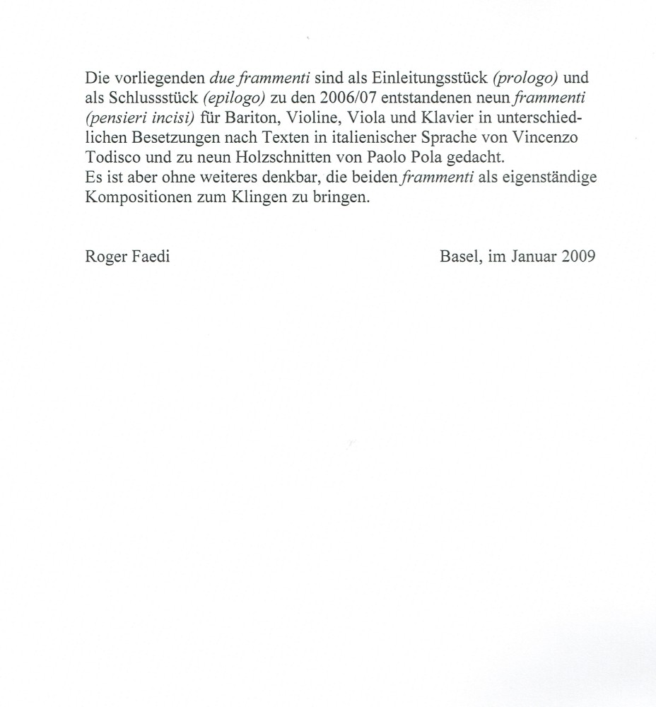 Die vorliegenden due frammenti sind als Einleitungsstück (prologo) und als Schlussstück (epilogo) zu den 2006/07 entstandenen neun frammenti (pensieri incisi) für Bariton, Violine, Viola und Klavier in unterschiedlichen Besetzungen nach Texten in italienischer Sprache von Vincenzo Todisco und zu neun Holzschnitten von Paolo Pola gedacht. Es ist aber ohne weiteres denkbar, die beiden frammenti als eigenständige Kompositionen zum Klingen zu bringen. Roger Faedi