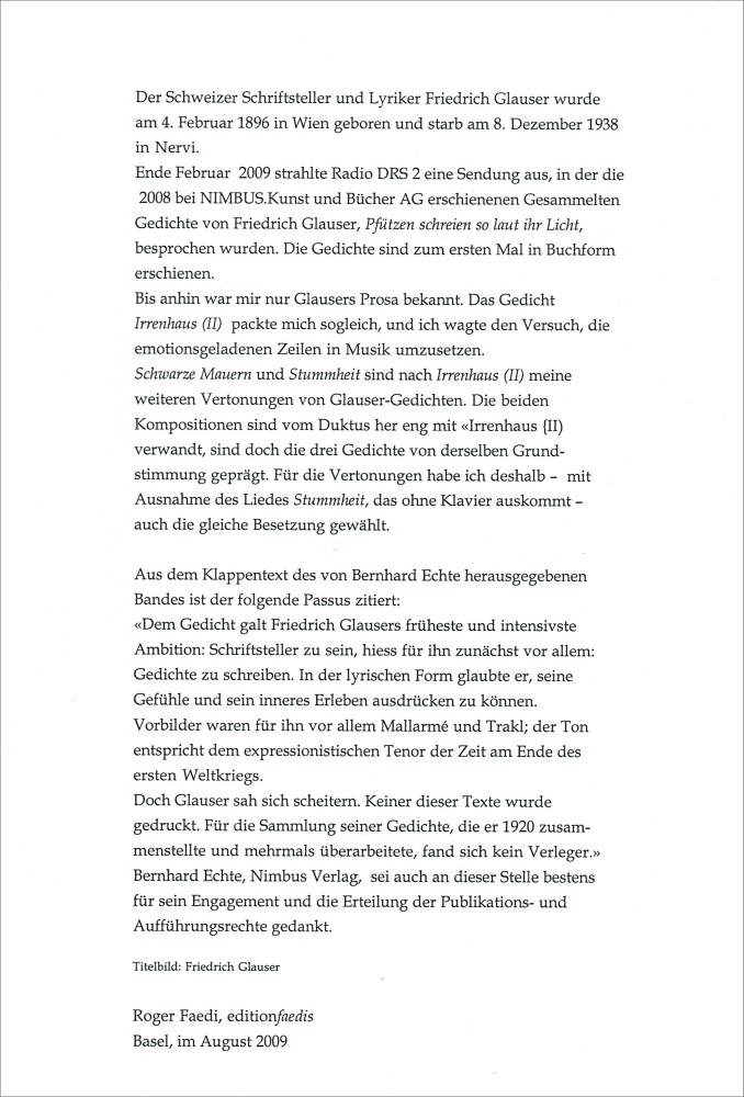 Der Schweizer Schriftsteller und Lyriker Friedrich Glauser wurde am 4. Februar 1896 in Wien geboren und starb am 8. Dezember 1938 in Nervi. Ende Februar 2009 strahlte Radio DRS 2 eine Sendung aus, in der die 2008 bei NIMBUS.Kunst und Bücher AG erschienenen Gesammelten Gedichte von Friedrich Glauser, Pfützen schreien so laut ihr Licht, besprochen wurden. Die Gedichte sind zum ersten Mal in Buchform erschienen. Bis anhin war mir nur Glausers Prosa bekannt. Das Gedicht Irrenhaus (II) packte mich sogleich, und ich wagte den Versuch, die emotionsgeladenen Zeilen in Musik umzusetzen. Schwarze Mauern und Stummheit sind nach Irrenhaus (II) meine weiteren Vertonungen von Glauser-Gedichten. Die beiden Kompositionen sind vom Duktus her eng mit «Irrenhaus (II)» verwandt, sind doch die drei Gedichte von derselben Grundstimmung geprägt. Für die Vertonungen habe ich deshalb - mit Ausnahme des Liedes «Stummheit», das ohne Klavier auskommt - auch die gleiche Besetzung gewählt.