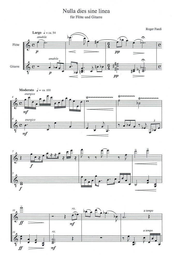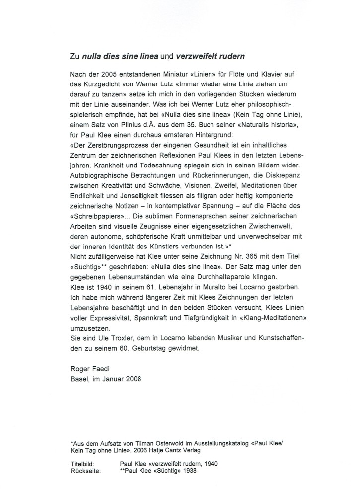 Nach der 2005 entstandenen Miniatur «Linien» für Flöte und Klavier auf das Kurzgedicht von Werner Lutz «Immer wieder eine Linie ziehen, um darauf zu tanzen» setze ich mich in dem vorliegenden Stück wiederum mit der Linie auseinander. Was ich bei Werner Lutz eher philosophisch-spielerisch empfinde, hat bei «Nulla dies sine linea» (Kein Tag ohne Linie) - einem Satz von Plinius d.Ä. aus dem 35. Buch seiner «Naturalis historia» - für Paul Klee einen durchaus ernsteren Hintergrund: In seinen letzten, von Krankheit geprägten Jahren zwischen 1937 und 1940 hat Klee besonders viel gezeichnet. Nicht zufälliger- weise hat er unter seine Zeichnung Nr. 365 mit dem Titel «Süchtig» geschrieben: «Nulla dies sine linea».